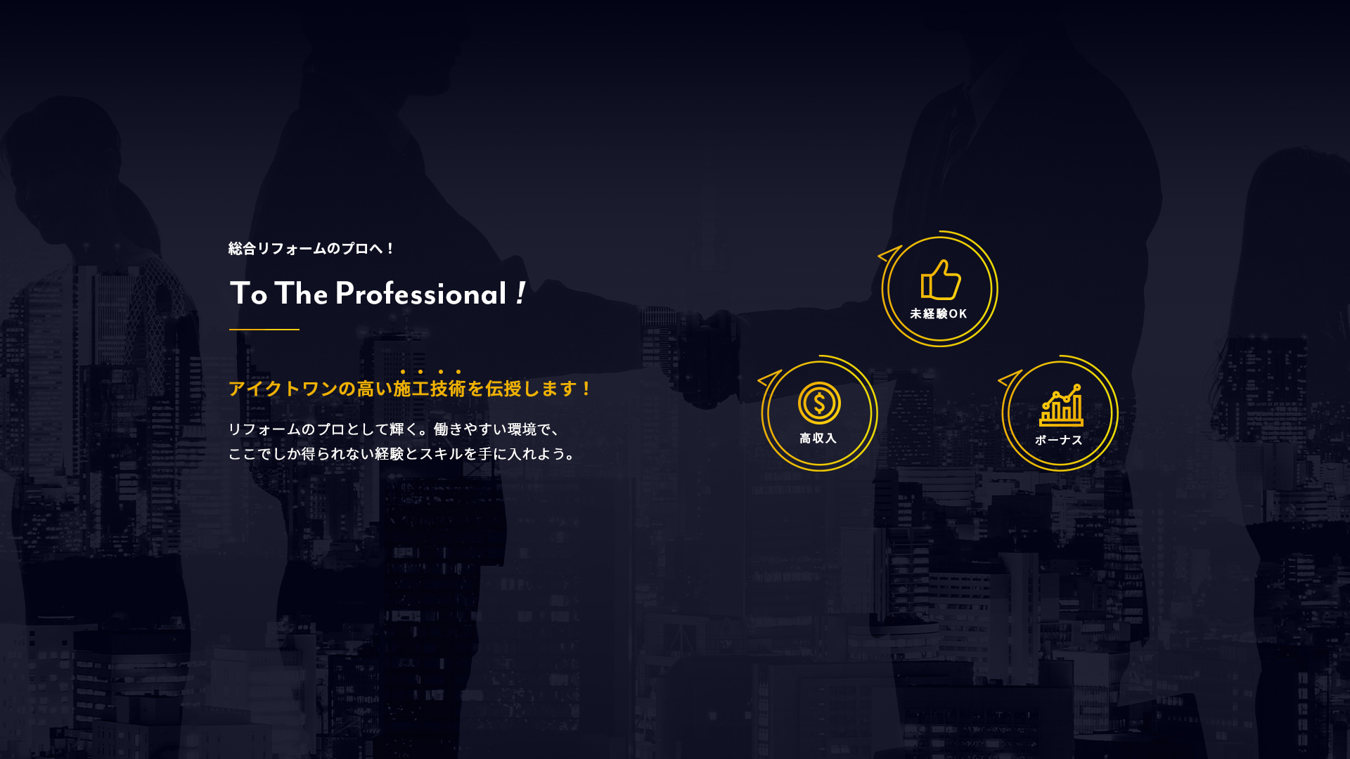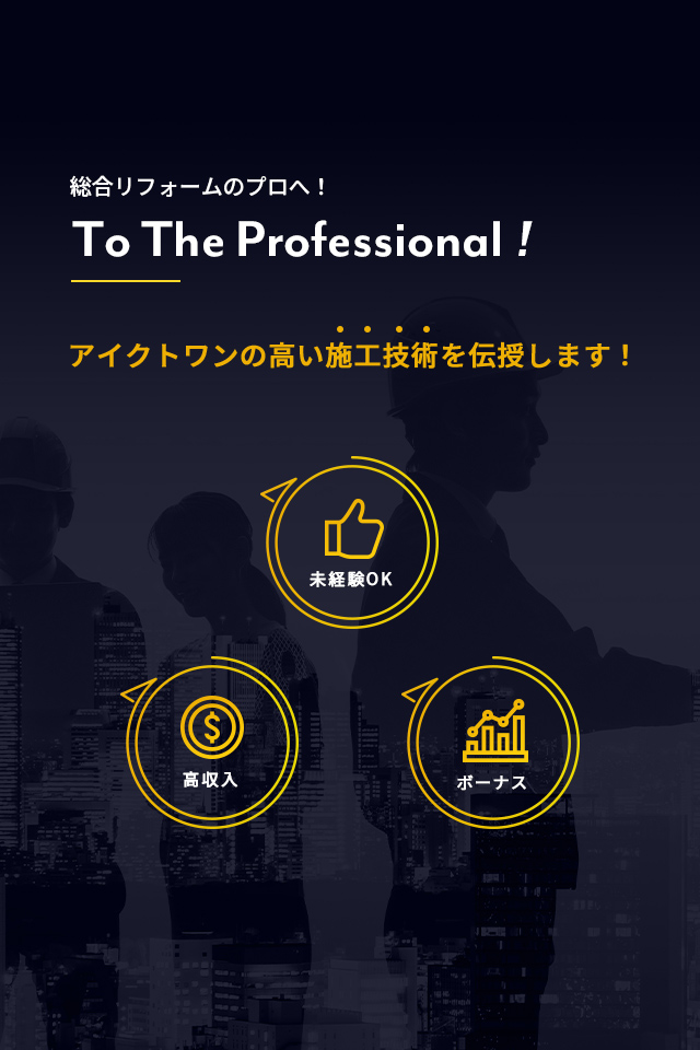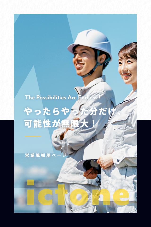 この度は、株式会社アイクトワンのホームページをご覧いただき誠にありがとうございます。アイクトワンは、千葉県船橋市に拠点を置き千葉県全域のエリアで防水工事、リフォーム工事を行っております。現在個人宅のお客様や企業様からの依頼を請け戸建て、アパート、マンションなどの一般住宅をメインに工場やビルなどもご依頼次第で請け負っておりますのでお気軽にご相談ください!またアイクトワンはもっと一緒に会社を盛り上げてくださる仲間を大募集しております!!